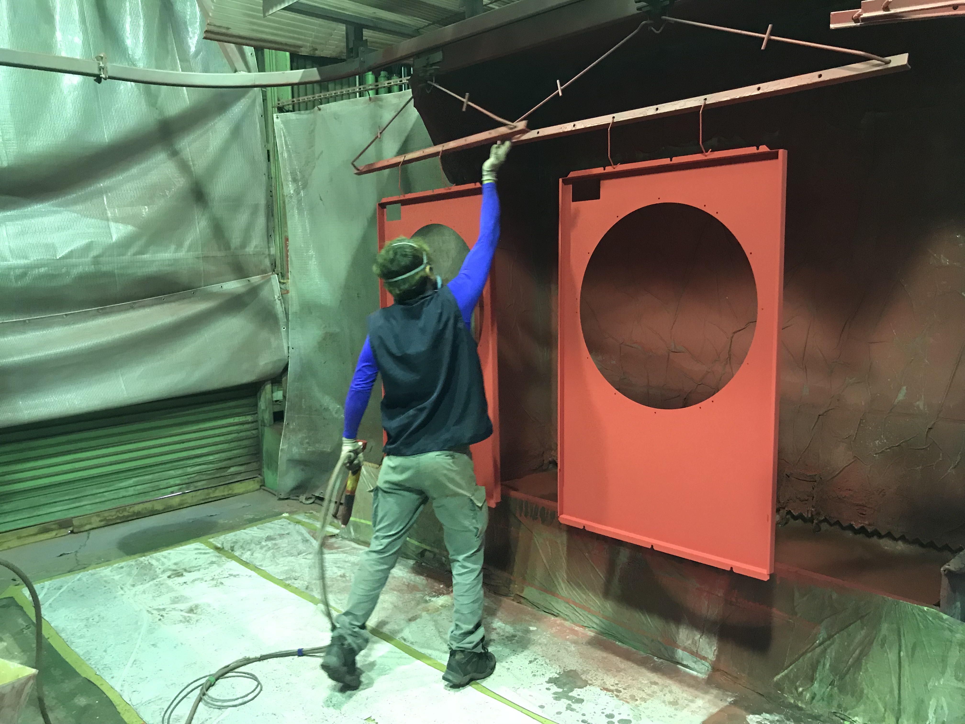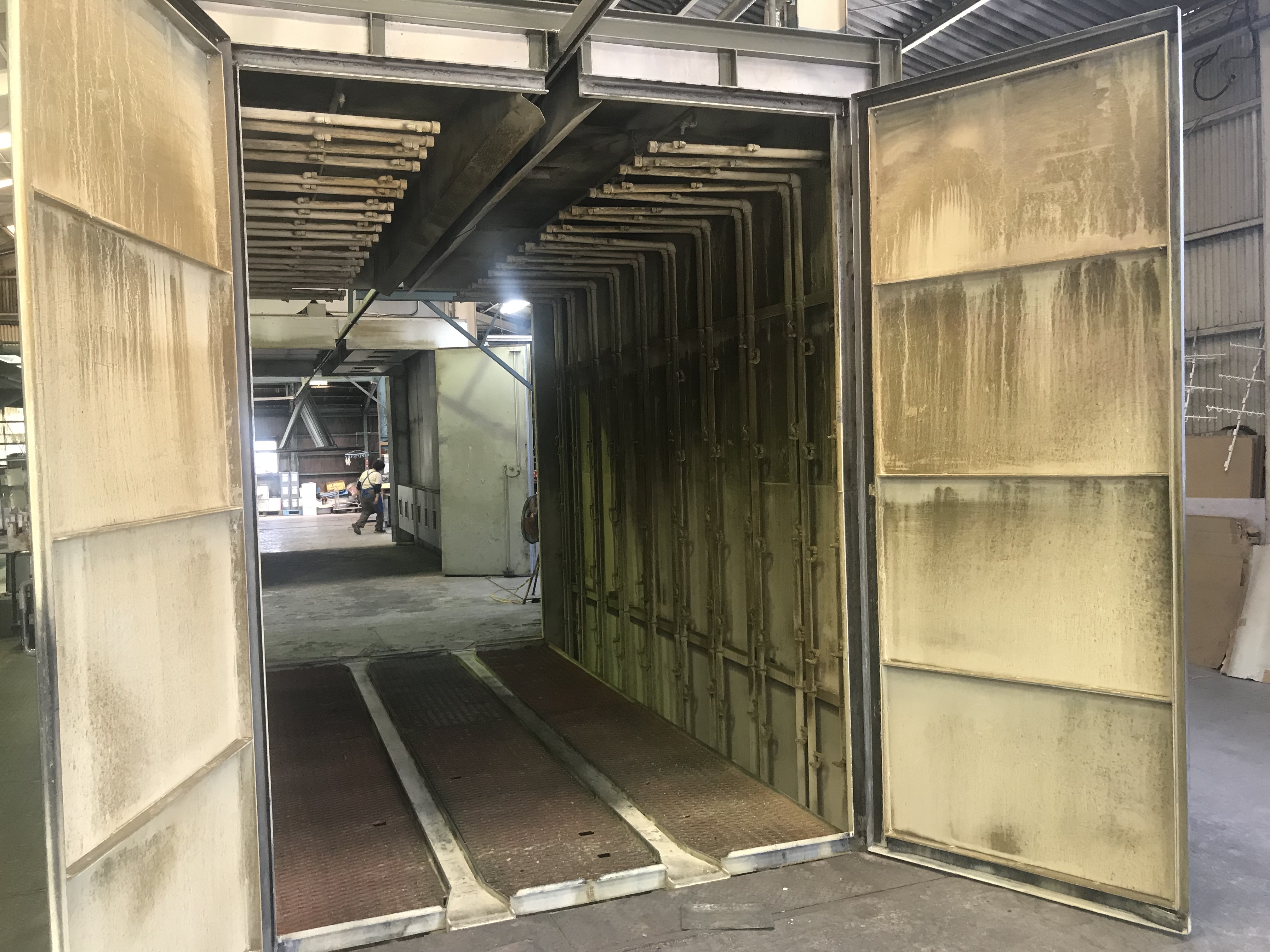 リン酸鉄前処理装置(H1.5m×W2m×D4m)、水切り乾燥炉(H1.5m×W2m×D4m)、水栓ブース(下塗り2m×3m・上塗り2m×3m)、焼付乾燥炉(1.5m×2m×6m)と流れます。